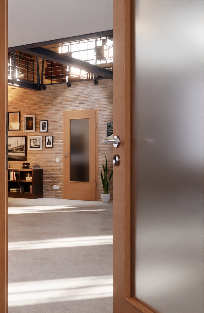 • Drzwi wewnętrzne fornirowane drewnem naturalnym w układzie pionowym, buk matowy