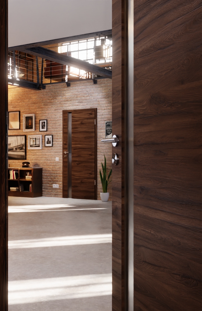 Nawet przy intensywnym użytkowaniu skrzydło drzwiowe pozostaje w formie dzięki rdzeniowej płycie pełnej. 3-częściowe zawiasy zapewniają mocne połączenie między ościeżnicą a skrzydłem drzwiowym.