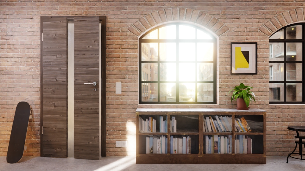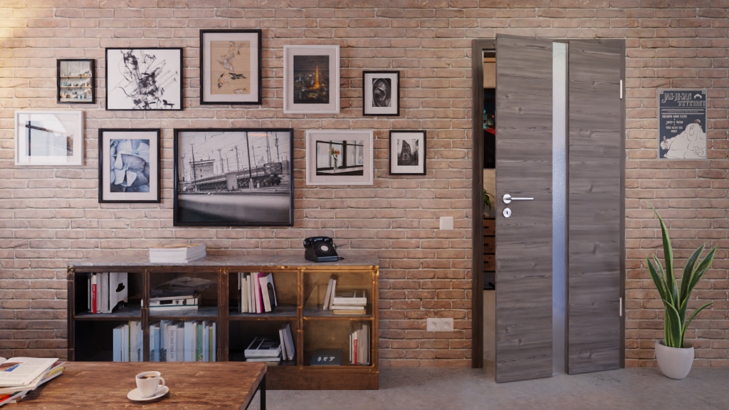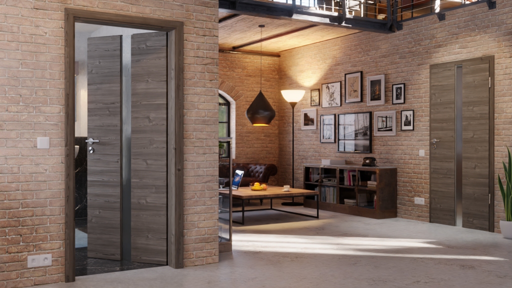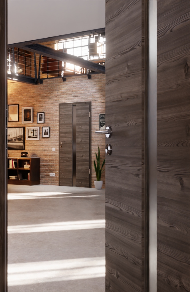 Ciemny odcień drewna w układzie poziomym sprawia, że Wasza przestrzeń mieszkalna zamienia się w oazę komfortu. Podłużny pas świetlny na środku skrzydła drzwi dodaje elegancji.
