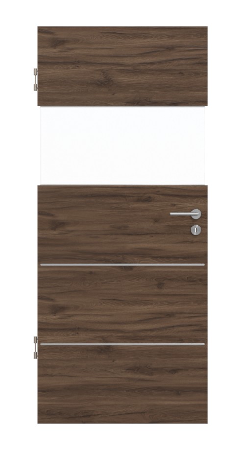 Ciemny odcień drewna w poziomej optyce działa uspokajająco i tworzy ciepłą atmosferę. Elegancki akcent zapewniają aplikacje ze stali nierdzewnej w dolnej części. Dzięki pasowi świetlnemu na wysokości oczu do Twojego domu wpada dużo światła.