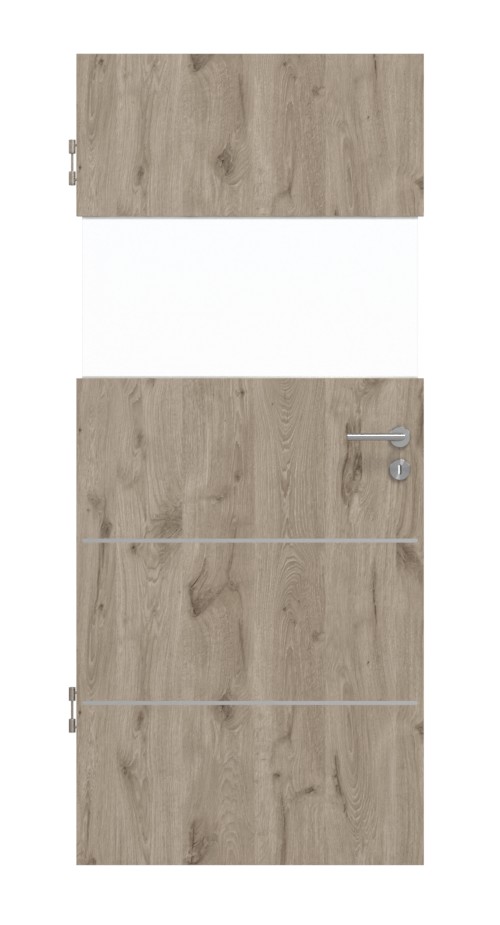 Widoczne usłojenie tworzy indywidualny panel drzwiowy. Na wysokości oczu znajduje się duża szyba, która zapewnia jasne pomieszczenia. Dwie aplikacje ze stali nierdzewnej w dolnej części panelu drzwiowego nadają modelowi elegancki akcent.