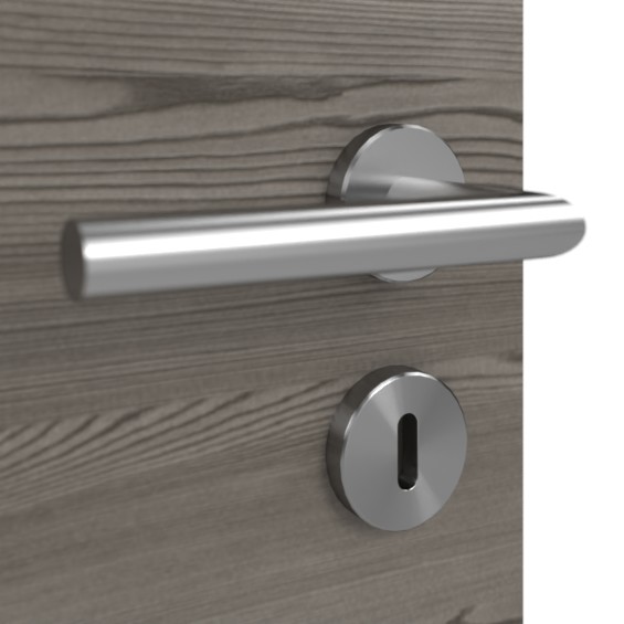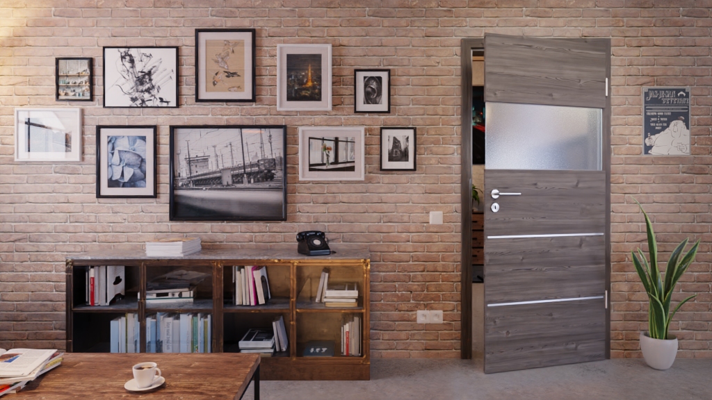 Ciemny odcień drewna w układzie poziomym sprawia, że Twoje wnętrze zamienia się w oazę komfortu. Na wysokości oczu znajduje się duża szyba, która zapewnia jasne pomieszczenia. Dwie aplikacje ze stali nierdzewnej w dolnej części skrzydła drzwi nadają modelowi elegancki akcent.