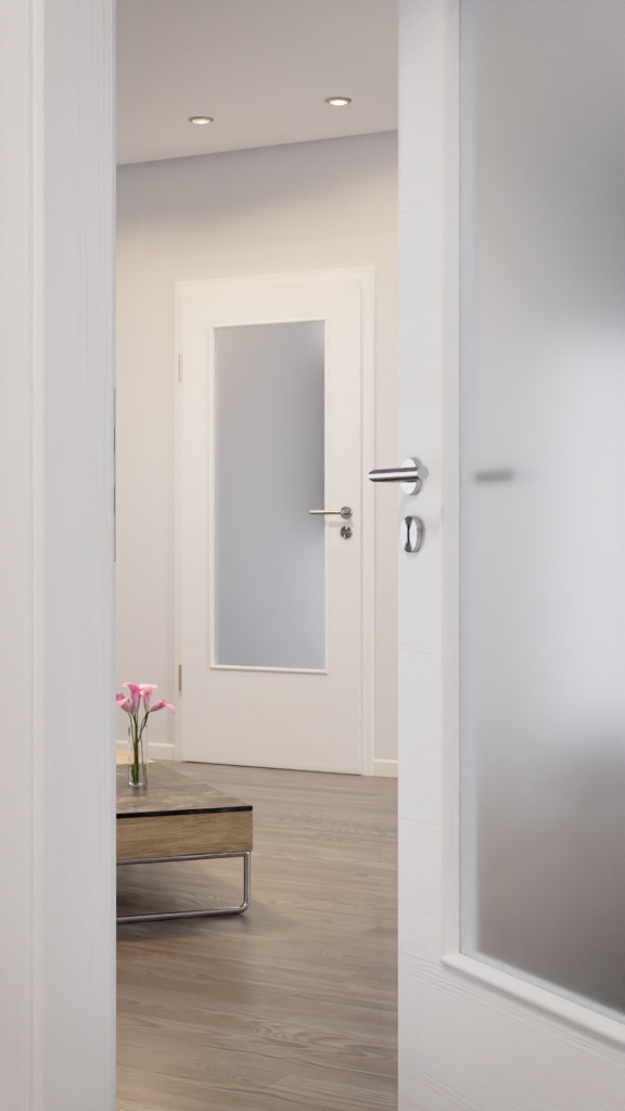 Trwały model ProLine w szczotkowanej bieli z 3-częściowymi zawiasami i płytą pełnoobwodową jako rdzeń drzwi: