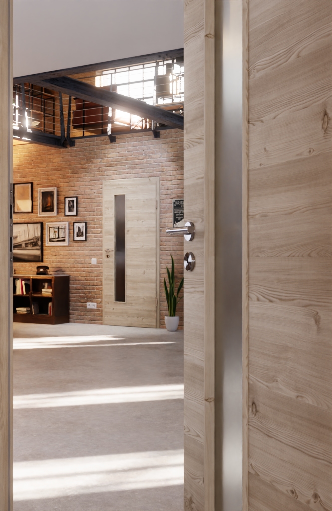 Trwały model ProLine w jasnym, szczotkowanym modrzewiu w poziomie z 3-częściowymi zawiasami i płytą pełnoobwodową jako rdzeń drzwi: