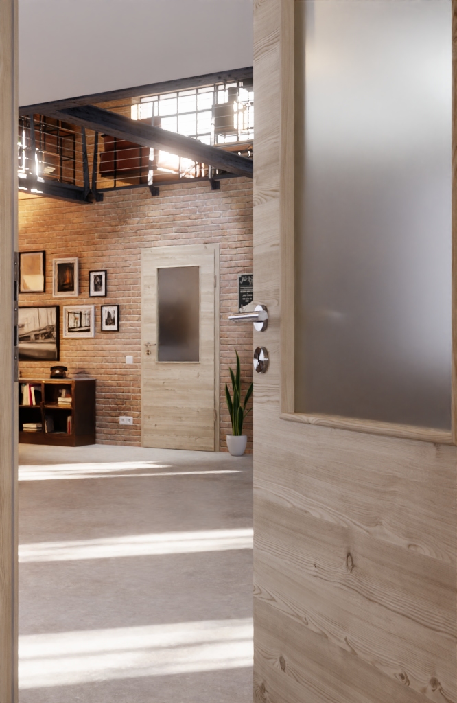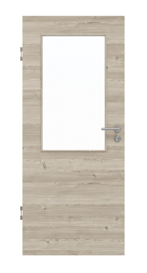 Robustne drzwi wewnętrzne ProLine w jasnym, szczotkowanym świerku poprzecznym, w tym płyta pełna i 3-częściowe zawiasy, które zapewniają stabilność: