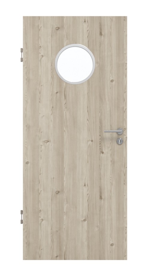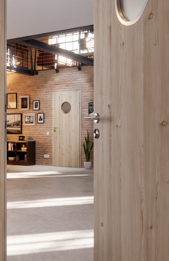 Codzienna, odporna na zużycie drzwi wewnętrzne ProLine w jasnym, szczotkowanym świerku, w tym płyta pełna i 3-częściowe zawiasy, które zapewniają stabilność: