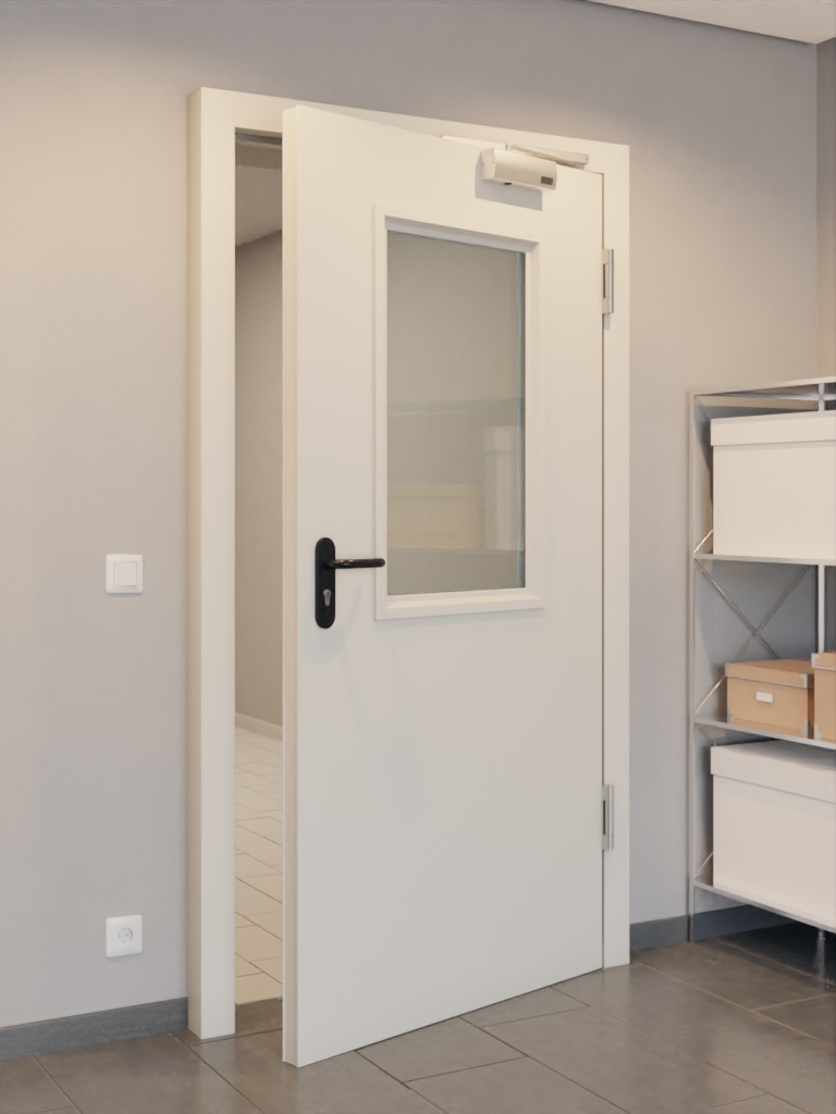 Przydatny zestaw kompletny marki Hörmann z stalowymi drzwiami przeciwpożarowymi T30-1 LA-B2, ościeżnicą i klamką: