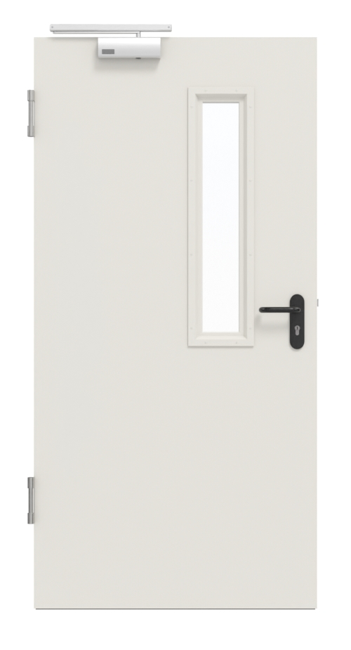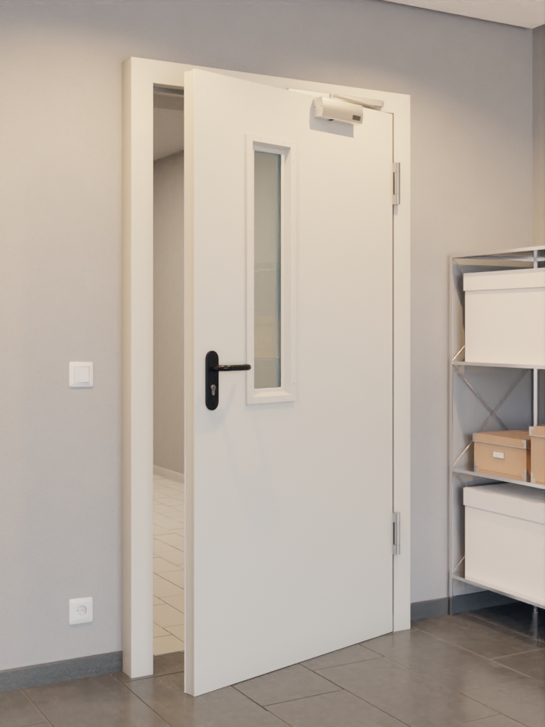 Przydatny zestaw kompletny marki Hörmann składający się z stalowych drzwi przeciwpożarowych T30-1 LA-B1, ościeżnicy i klamki: