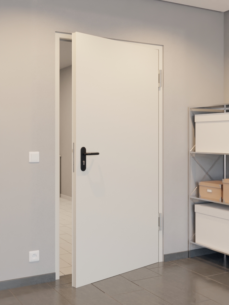 Praktyczny zestaw drzwi wewnętrznych od Hörmann z stalowymi drzwiami wielofunkcyjnymi MZ-1, ościeżnicą blokową 62/55 i klamką: