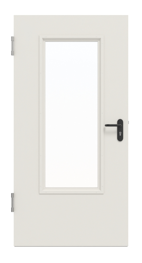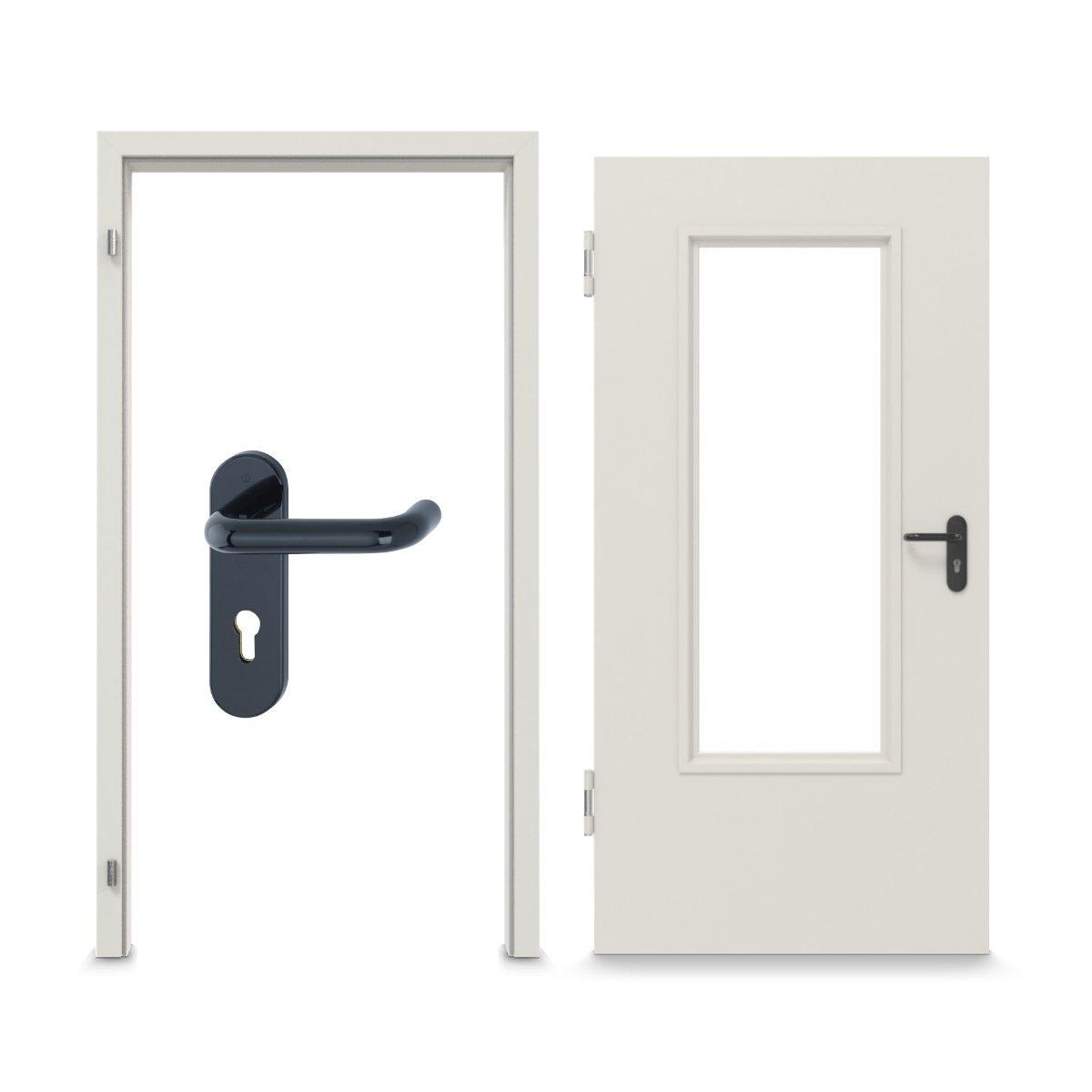 Kompletny zestaw drzwi wewnętrznych od Hörmann, w tym stalowe drzwi wielofunkcyjne MZ-1 LA-B3, ościeżnica i klamka: