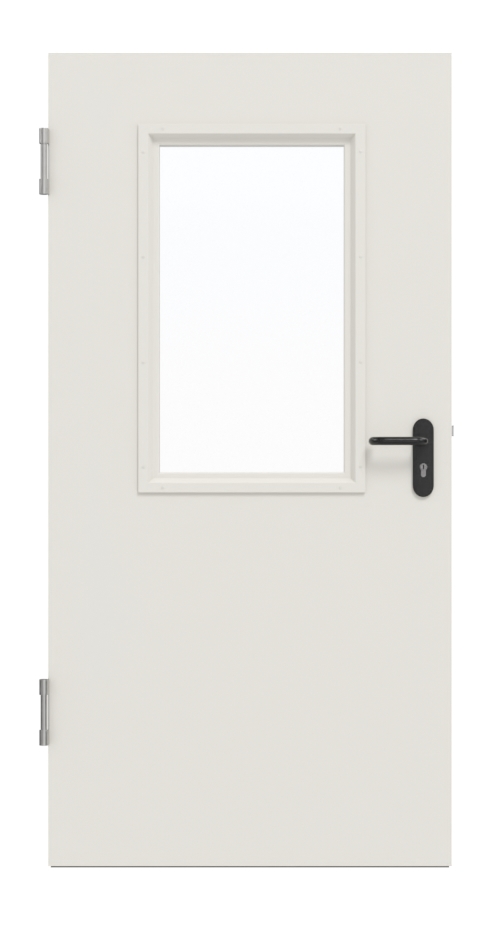 Drzwi mają grubość 62 mm i są wyposażone w konstrukcję warstwową przyklejoną na całej powierzchni wewnątrz skrzydła. Powierzchnia została zagruntowana w kolorze szaro-białym RAL 9002. Zawiasy drzwiowe są przykręcone , dzięki czemu można je bez problemu wymienić.