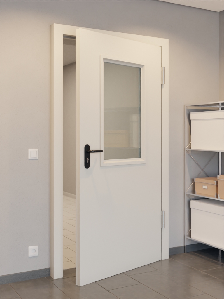 Kompletny zestaw drzwi wewnętrznych od Hörmann składający się z stalowych drzwi wielofunkcyjnych MZ-1 LA-B2, ościeżnicy oraz klamki: