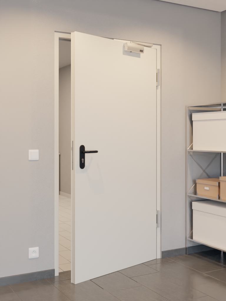 Przydatny zestaw kompletny marki Hörmann z stalowymi drzwiami przeciwpożarowymi T30-1, ościeżnicą blokową 62/55 i klamką drzwiową: