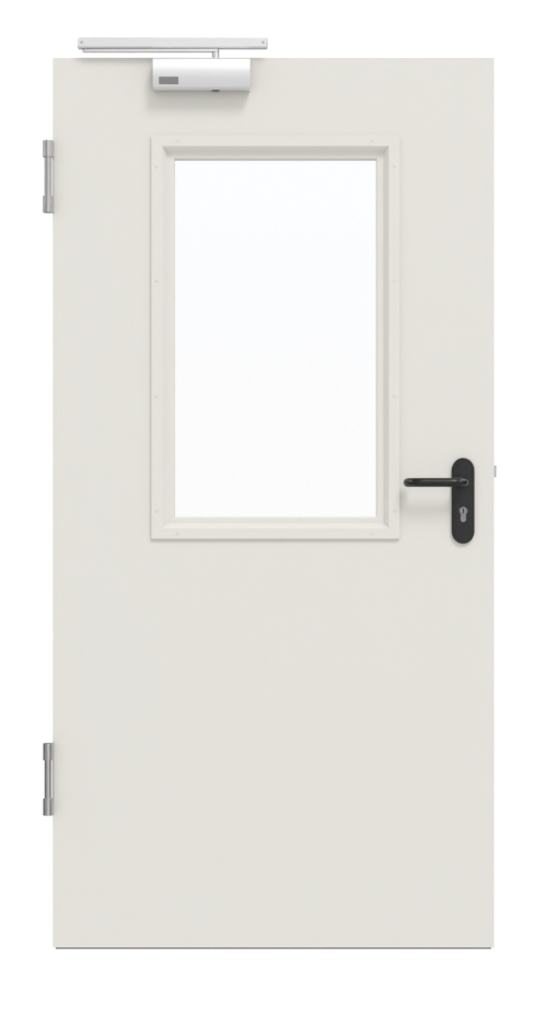 Przydatny zestaw kompletny marki Hörmann składający się z stalowych drzwi przeciwpożarowych T30-1 LA-B2, ościeżnicy blokowej 62/55 oraz klamki drzwiowej: