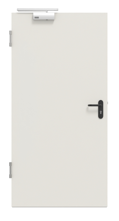 Przydatny zestaw kompletny marki Hörmann, w tym stalowe drzwi przeciwpożarowe T30-1, ościeżnica narożna i klamka: