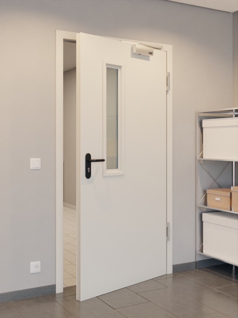 Praktyczny zestaw drzwi wewnętrznych od Hörmann składający się z stalowych drzwi przeciwpożarowych T30-1 LA-B1, ościeżnicy narożnej i klamki: