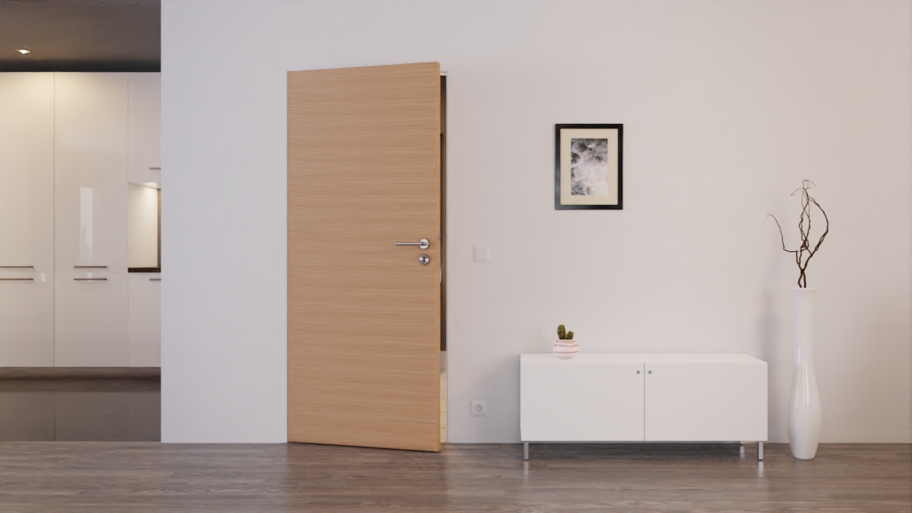 W rdzeniu 45 mm grubego skrzydła drzwiowego znajduje się płyta wiórowa, która zapewnia wysoką trwałość. Standardowy zakres dostawy obejmuje nie tylko samo skrzydło drzwiowe, ale także niewidoczną ościeżnicę aluminiową oraz klamkę. W cenie zawarte są również dwa ukryte zawiasy Tectus, zamek magnetyczny oraz uszczelka ościeżnicy.