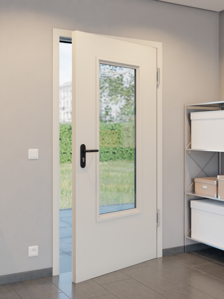 Kompletny zestaw od Hörmann w tym stalowe drzwi wielofunkcyjne MZ-1 LA-B3, ościeżnica narożna i klamka: