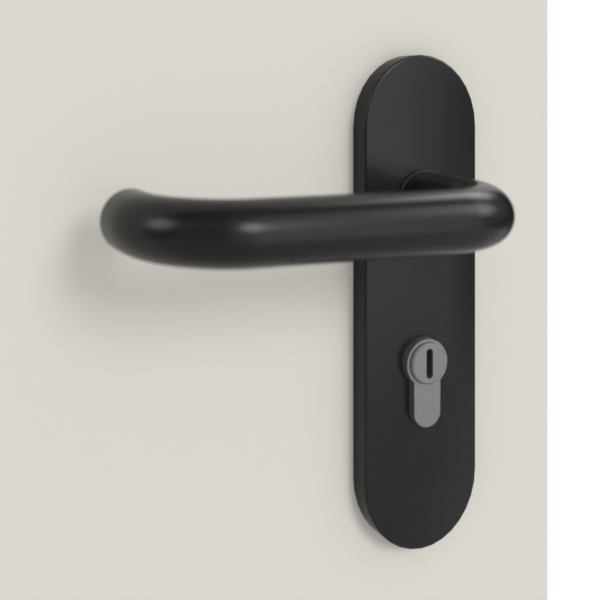 Czarny zestaw klamek z tworzywa sztucznego typ D-110 z krótkim szyldem dopełnia kompletny zestaw: