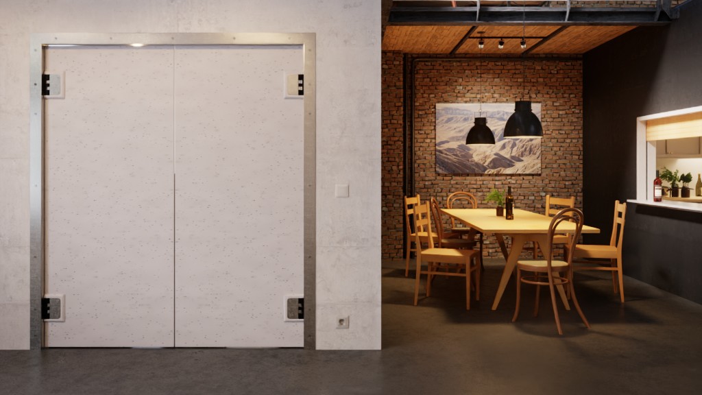Zapewnia płynne przejście: Dwuskrzydłowe drzwi wahadłowe z tworzywa sztucznego od Hörmann umożliwiają łatwe przechodzenie z jednego pomieszczenia do drugiego.