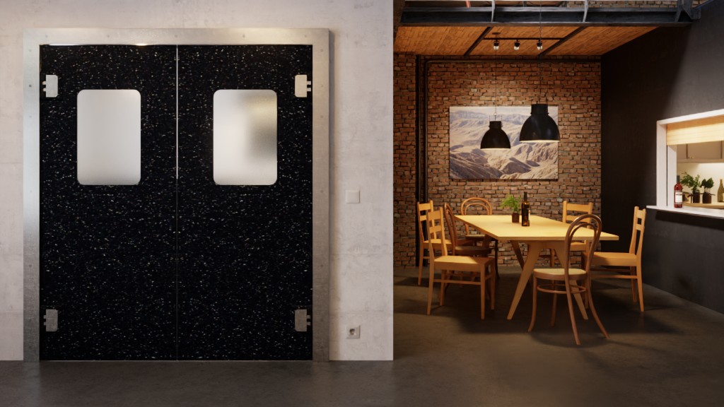 Drzwi wahadłowe wykonane są z wytrzymałego i odpornego na złamania polietylenu. Skrzydło drzwi ma grubość 15 mm i jest zaokrąglone na krawędziach. Zintegrowane przeszklenia składają się z 15 mm grubego szkła akrylowego i są osadzone na równi z powierzchnią.