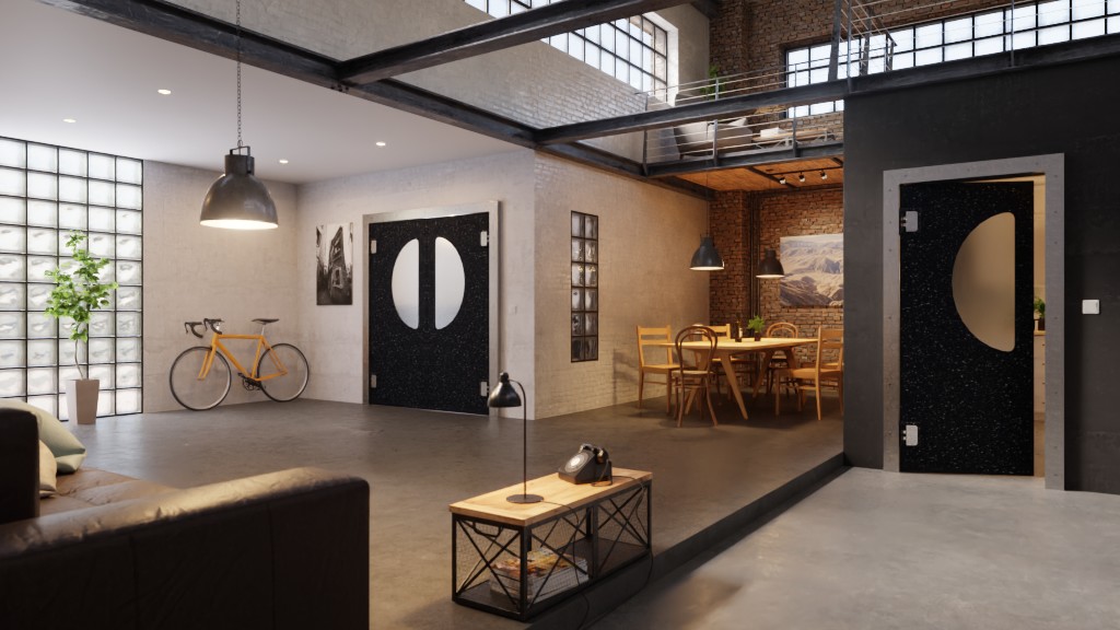 Kolorowe kropki są rozmieszczone na czarnej powierzchni. Ta niezwykła kombinacja tworzy unikalny design. Półokrągłe otwory szklane wpuszczają światło i jednocześnie oferują widok na sąsiednie pomieszczenie.