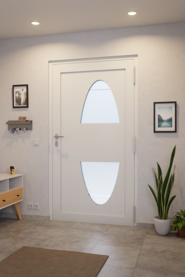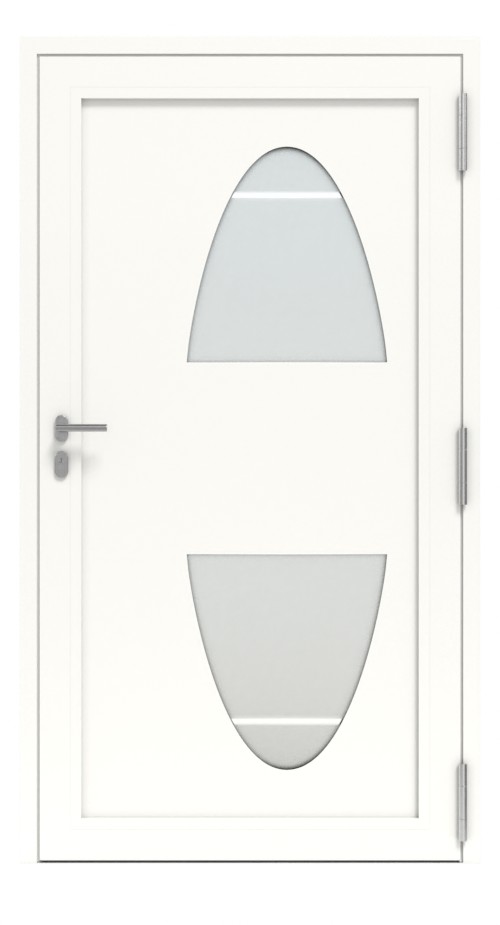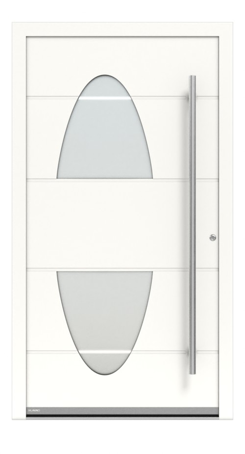 Cztery poziome rowki – charakterystyczna cecha tej serii – nadają modelowi stylowy wygląd zewnętrzny. Dwa duże, półowalne wycięcia na szybę sprawiają, że te drzwi zewnętrzne przyciągają wzrok. W szkle drobno piaskowanym nawiązują one do charakterystycznych rowków i zapewniają dużą ilość światła w wnętrzu przedpokoju przy jednoczesnej wysokiej ochronie prywatności.