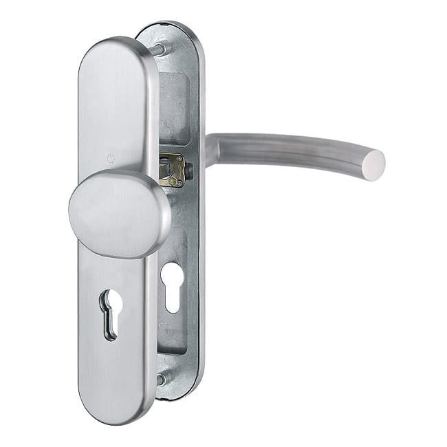 Zestaw zabezpieczający dodatkowo chroni drzwi wejściowe do mieszkania przed manipulacjami z zewnątrz. Została ona przetestowana i certyfikowana zgodnie znormą DIN 18257. Dodatkowym atutem tego okucia jest jego wytrzymałość, wynikająca z wykonania ze stali szlachetnej oraz podkonstrukcji. To, że uchwyt nie traci swojej poziomej pozycji nawet po wielu latach użytkowania, zawdzięcza zintegrowanej sprężynie powrotnej.