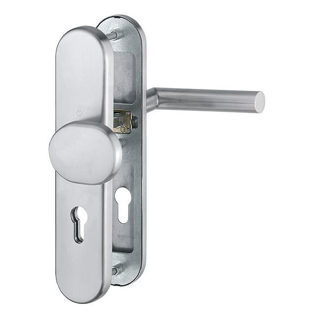 Zamek z zabezpieczeniem przed zmianą ze stali szlachetnej wyróżnia się swoją wytrzymałością. Model posiadający certyfikat DIN 18257utrudnia mechaniczne ataki z zewnątrz, zabezpieczając również trzpień drzwi przed manipulacją. Podkonstrukcja zwiększa stabilność. W klamce zintegrowana jest sprężyna podtrzymująca, która zapewnia jej poziomą pozycję nawet po wielu latach użytkowania.