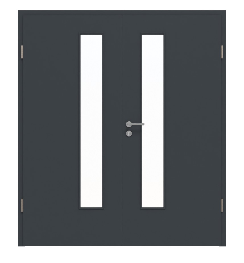 Atrakcyjna, dwuskrzydłowa drzwi do pomieszczeń mieszkalnych z rdzeniem z pełnego wióru i gładką powierzchnią lakieru w kolorze antracytowym podobnym do RAL 7016: