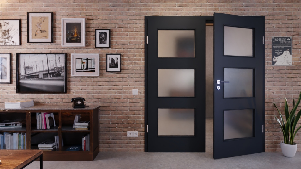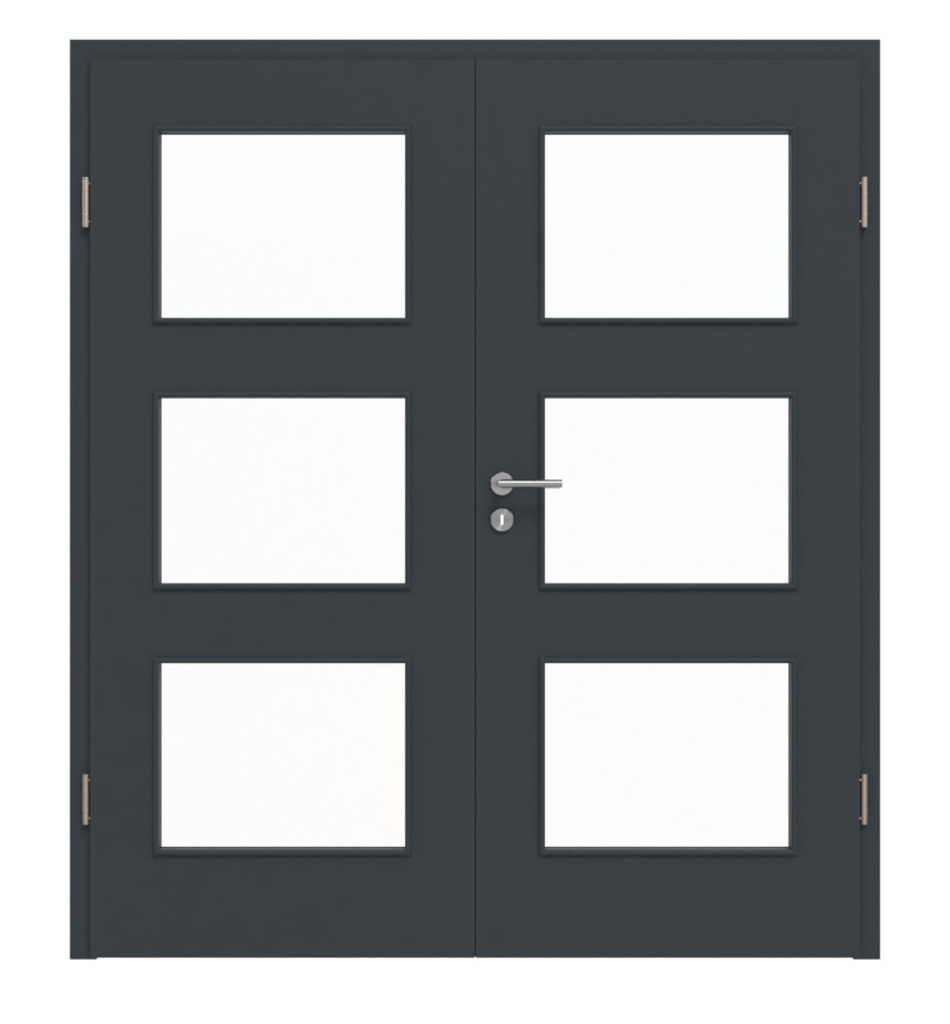 Atrakcyjna, podwójna wewnętrzna drzwi z rdzeniem z pełnego wióra i gładkim wykończeniem lakieru w kolorze antracytowym podobnym do RAL 7016: