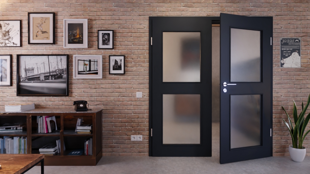 Stylowa podwójna drzwi z pełnym rdzeniem i równomiernym wykończeniem lakierem w antracycie podobnym do RAL 7016: