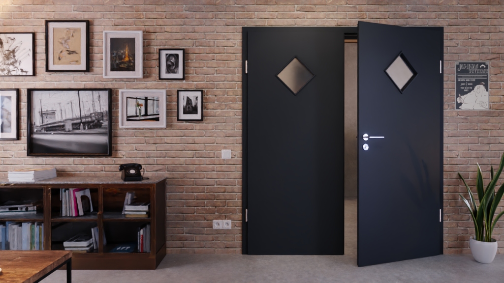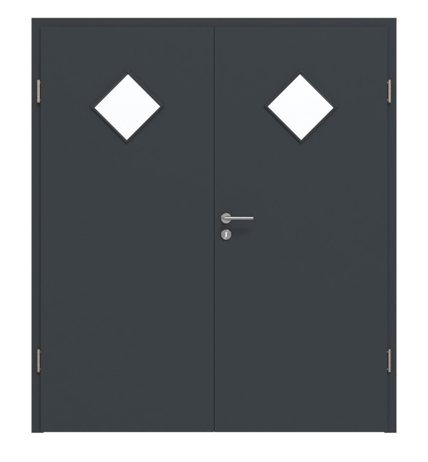 Stylowa, dwuskrzydłowa drzwi do wnętrz z pełnymi wzmocnieniami i równomiernym wykończeniem lakieru w kolorze antracytowym podobnym do RAL 7016: