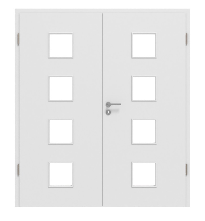 Równo w linii znajdują się cztery kwadratowe okna świetlne na środku obu skrzydeł drzwiowych. Dzięki stonowanej kolorystyce w odcieniu Bütte białe, model ten można łączyć z każdym stylem wnętrza. Dodatkowo, powierzchnia Durat charakteryzuje się wysokim komfortem pielęgnacji oraz wyjątkową odpornością na uderzenia i zarysowania.
