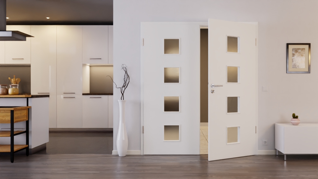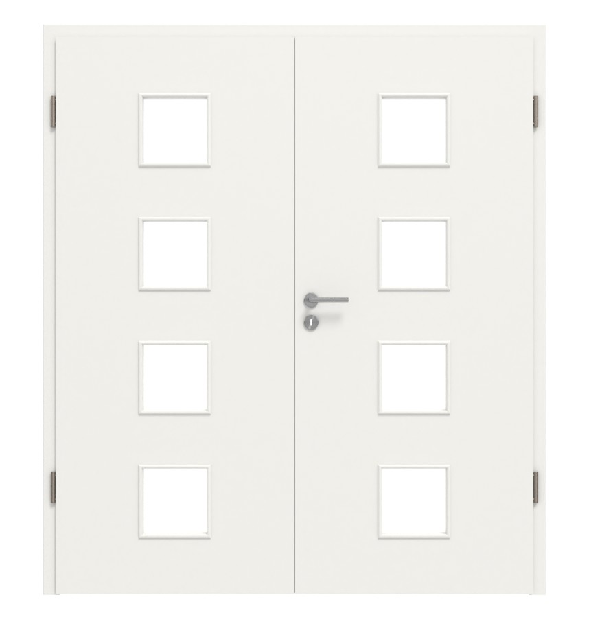Harmoniczne, podwójne drzwi wewnętrzne z rdzeniem z pełnego wióru i odpornym na ścieranie Durat w dekorze białego lakieru podobnym do RAL 9016: