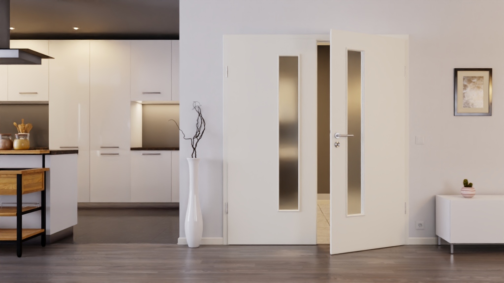 Nowoczesne, podwójne drzwi pokojowe z rdzeniem z pełnego wióra i gładką powierzchnią lakierowaną w białym kolorze podobnym do RAL 9010:
