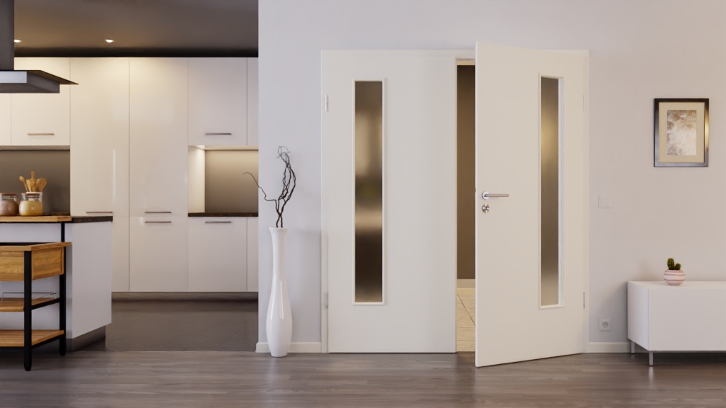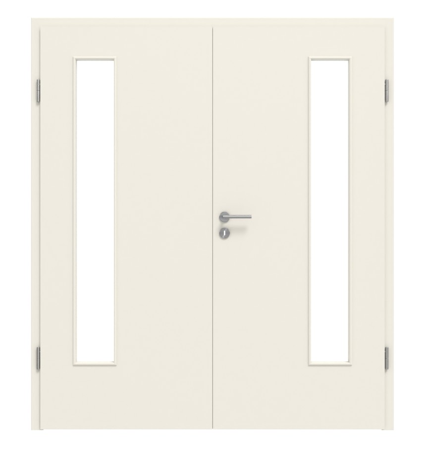 Nowoczesne drzwi skrzydłowe z wkładką pełnoobwodową i gładkim wykończeniem lakieru w białym kolorze podobnym do RAL 9010:
