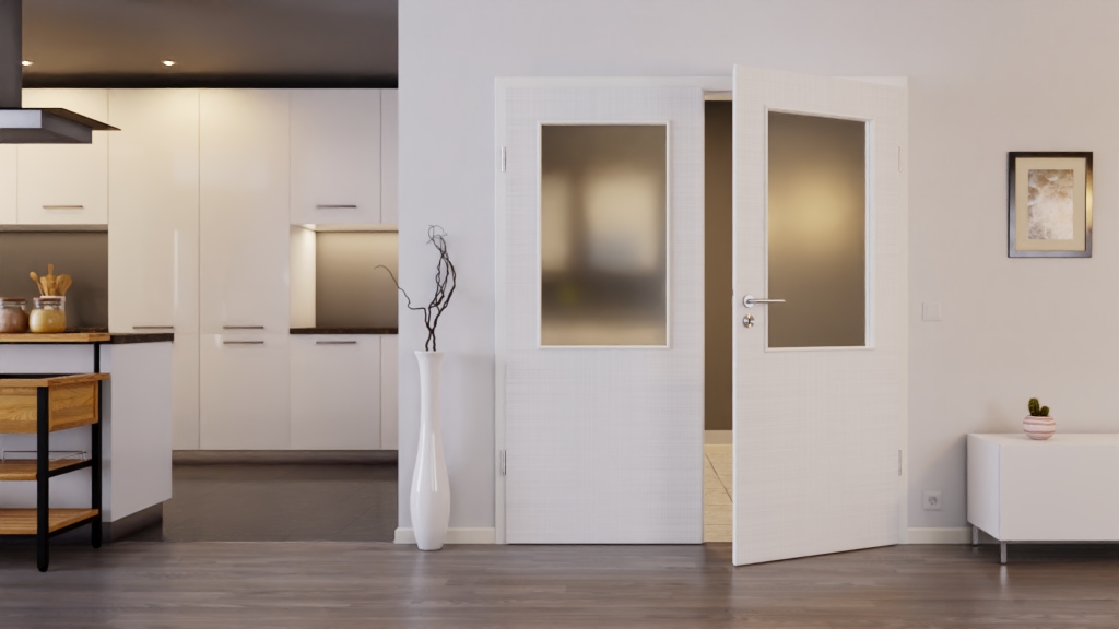 Stylowe drzwi podwójne z pełnymi ościeżnicami i odporną na uderzenia powierzchnią Durat w kolorze białym Cotton like: