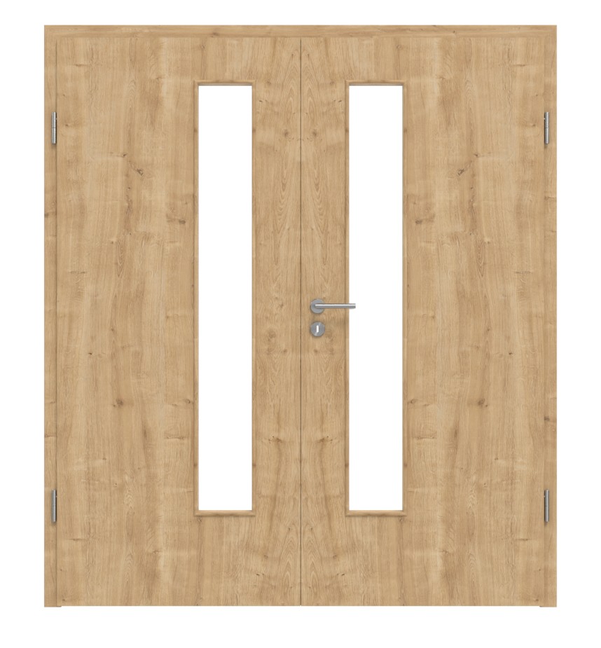 Stylowe drzwi podwójne z wkładką z pełnej płyty i odpornym na zarysowania wykończeniem Durat w dębie z sękami: