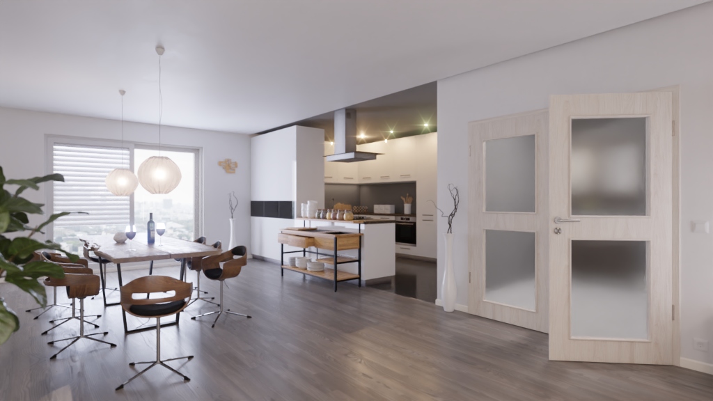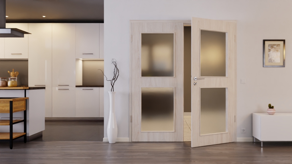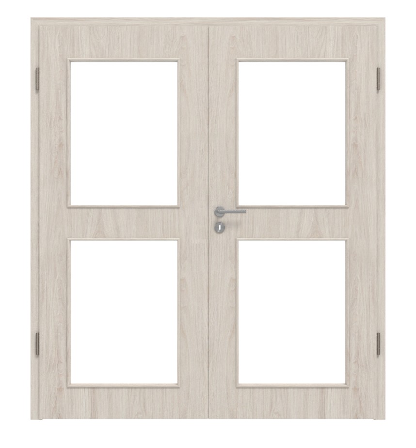 Piękne drzwi podwójne z wkładką pełnościenną i praktycznym dekoracyjnym wykończeniem Durat w lakierowanym dębie: