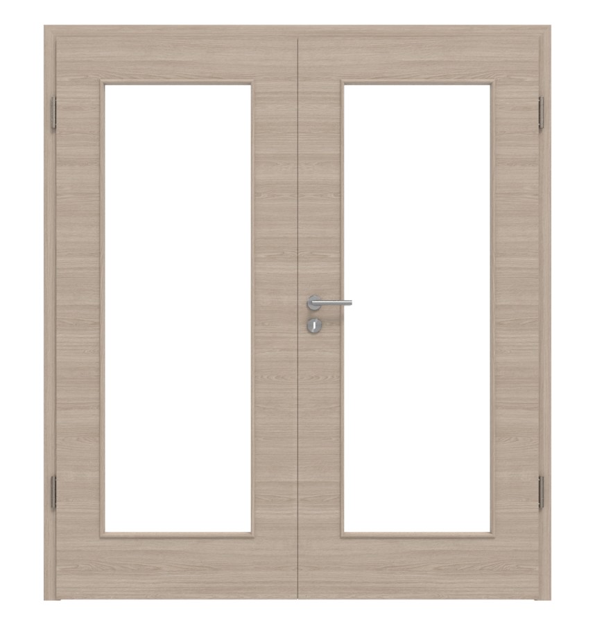 Harmonijne, podwójne drzwi wewnętrzne z rdzeniem pełnoobciążeniowym i odporną na światło okleiną Durat w szarym dębie w poziomie: