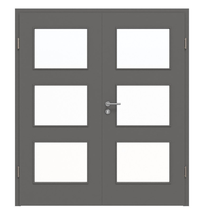 Nowoczesne, podwójne drzwi do wnętrz z pełnymi wzmocnieniami i równomiernym wykończeniem lakierem w kolorze Hygge szarym: