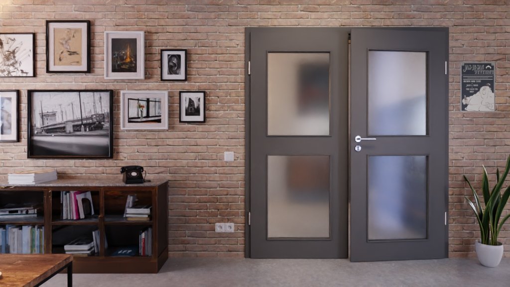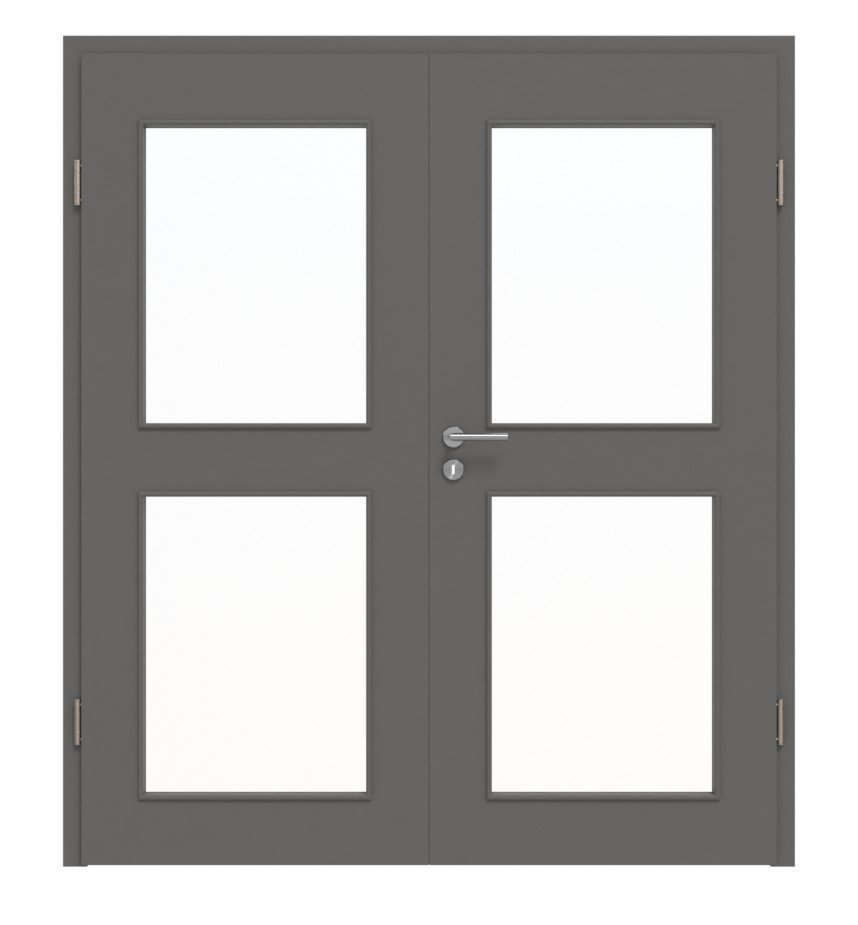 Harmonijne, dwuskrzydłowe drzwi do wnętrz z rdzeniem z pełnych płyt wiórowych i gładkim wykończeniem lakierem w kolorze szarości Hygge: