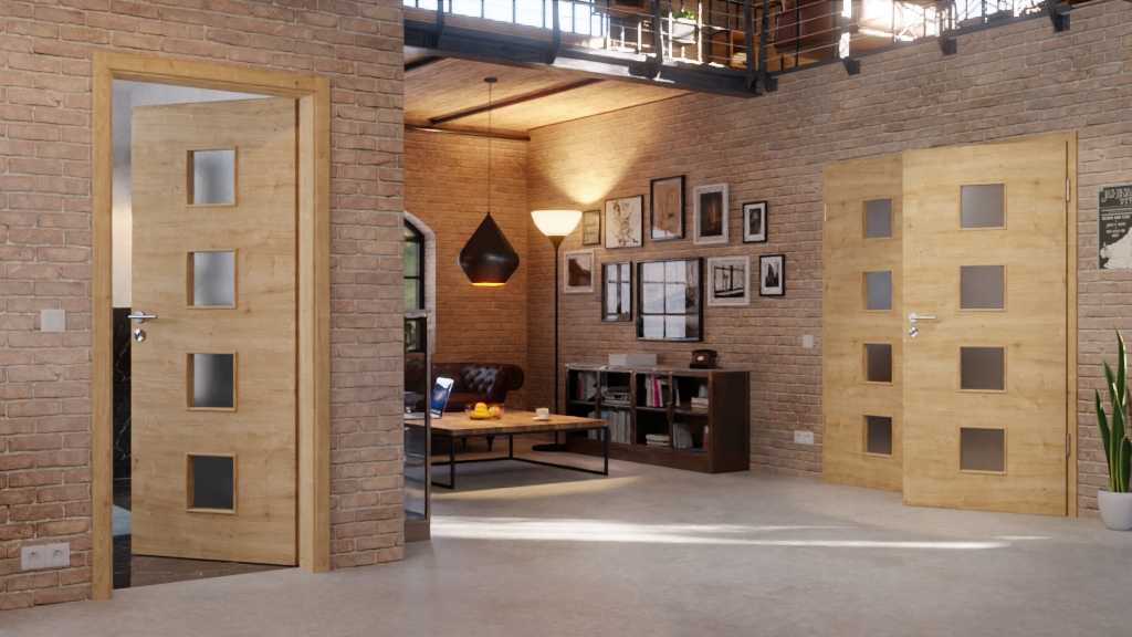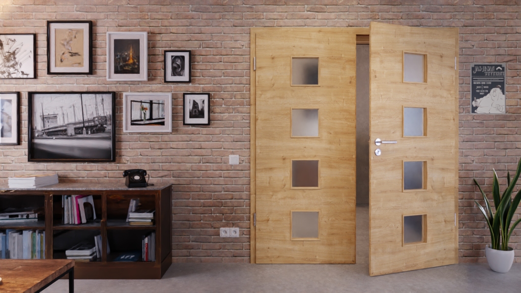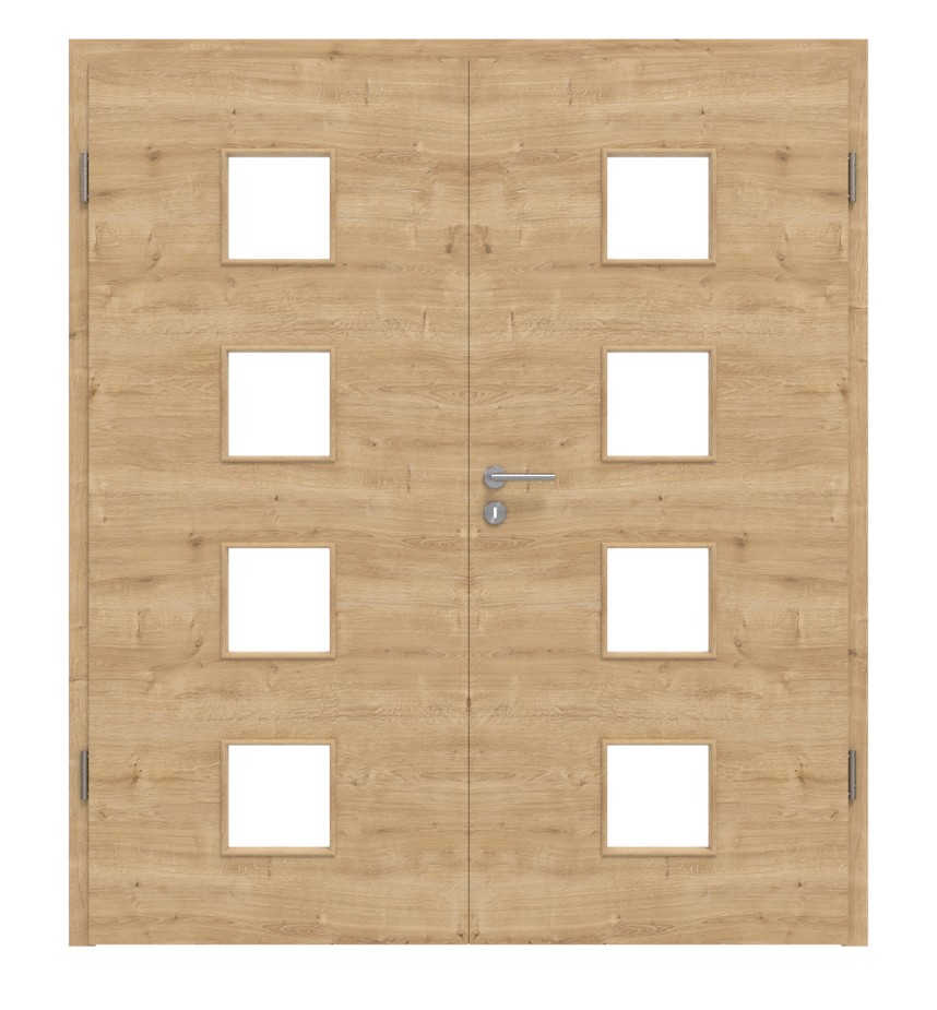 Nowoczesne, podwójne drzwi wewnętrzne z rdzeniem z pełnych płyt wiórowych i codziennie sprawdzoną powłoką Durat w poziomej dębie: