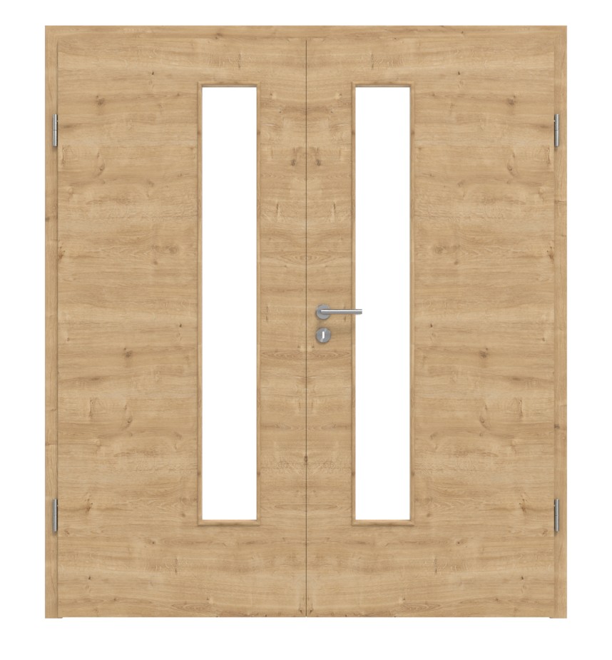 Nowoczesny duet drzwi z pełnymi wzmocnieniami i łatwą w pielęgnacji powierzchnią Durat w dębie o poprzecznych słojach: