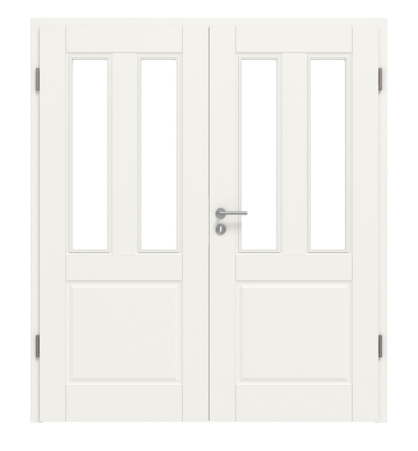Praktyczne drzwi podwójne w klasycznym białym lakierze z profilami frezowanymi: