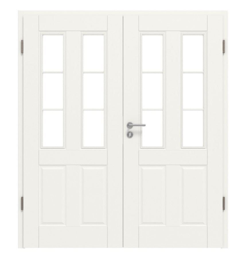 Ponadczasowe drzwi wewnętrzne podwójne w białym lakierze z profilowanymi frezami: