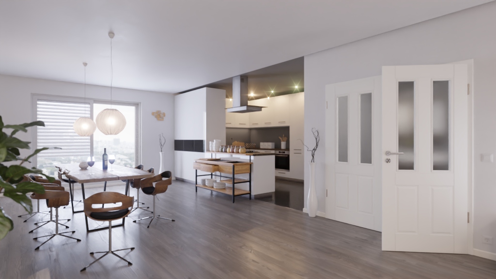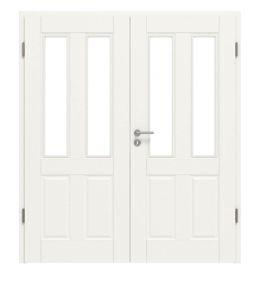 Ponadczasowe drzwi wewnętrzne podwójne w białym lakierze z profilowanymi frezami: