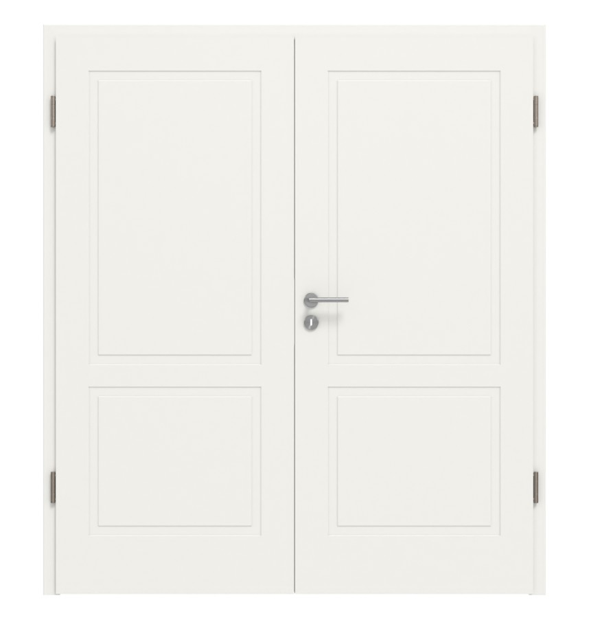Powierzchnia drzwi podwójnych jest piękna dzięki białemu lakierowi na wysoki połysk w RAL 9010 lub RAL 9016. Połączenie kanciastych krawędzi skrzydeł drzwiowych i wbudowanej ramy przywołuje klasyczne oraz nowoczesne elementy stylu. Oba skrzydła drzwiowe mają stylowy wygląd kasetowy.