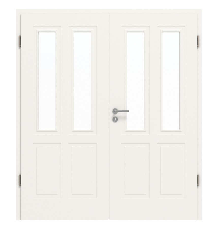 Powierzchnia drzwi wewnętrznych podwójnych dzięki białemu lakierowi na wysoki połysk w RAL 9010 lub RAL 9016 prezentuje się pięknie. Połączenie kwadratowych krawędzi skrzydeł drzwiowych z wbudowaną ramą tworzy zarówno klasyczny element, jak i nowoczesny akcent. Podłużne przeszklenia w połączeniu z efektem kasetowym tworzą spójną całość.